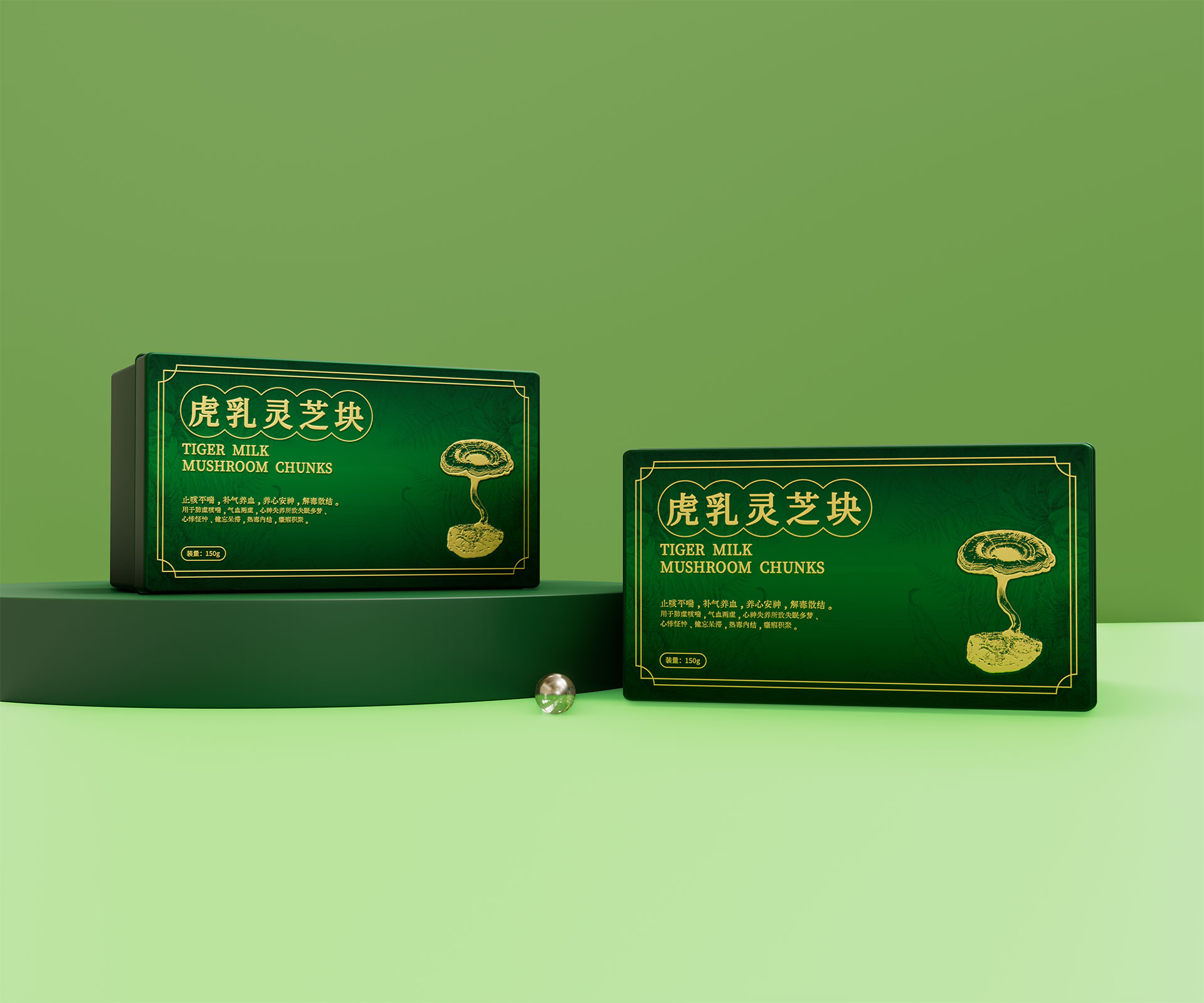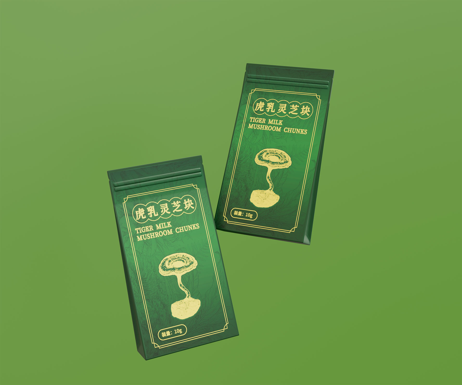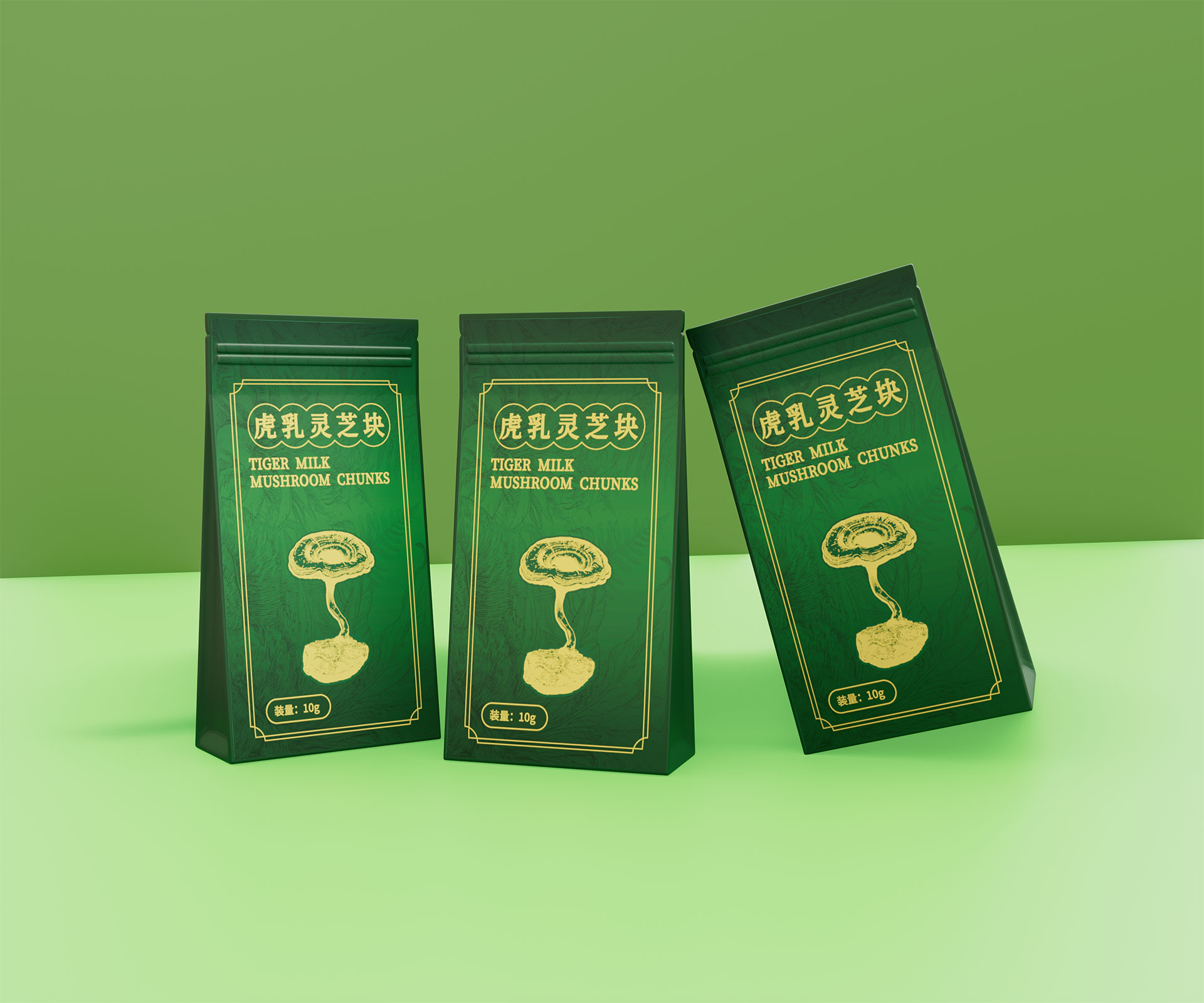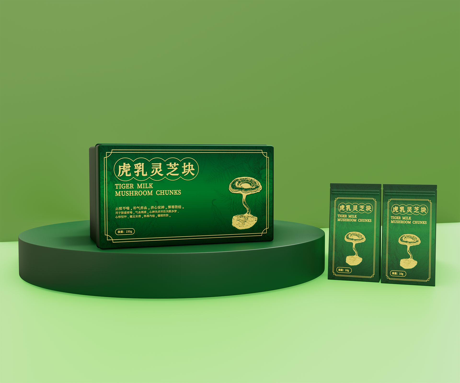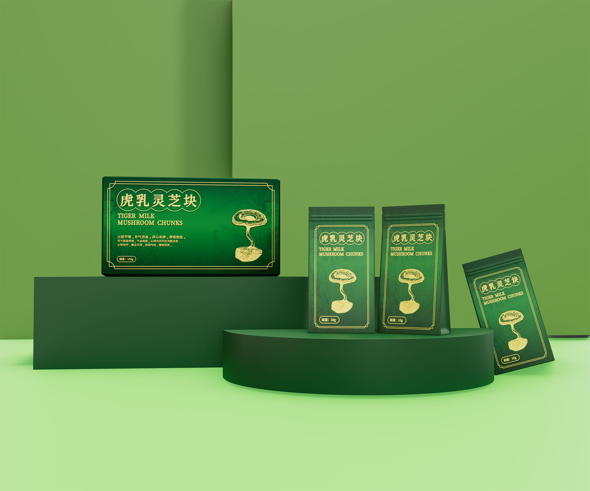 標(biāo)志與字體系統(tǒng):設(shè)計中英文組合標(biāo)志。“虎乳靈芝”中文采用典雅的手寫書法字體,體現(xiàn)文化傳承;“TIGERMILK MUSHROOM CHUNKS”英文部分采用現(xiàn)代、簡約的無襯線字體,確保國際識別性。二者結(jié)合,奠定“東方底蘊,國際表達(dá)”的基調(diào)。